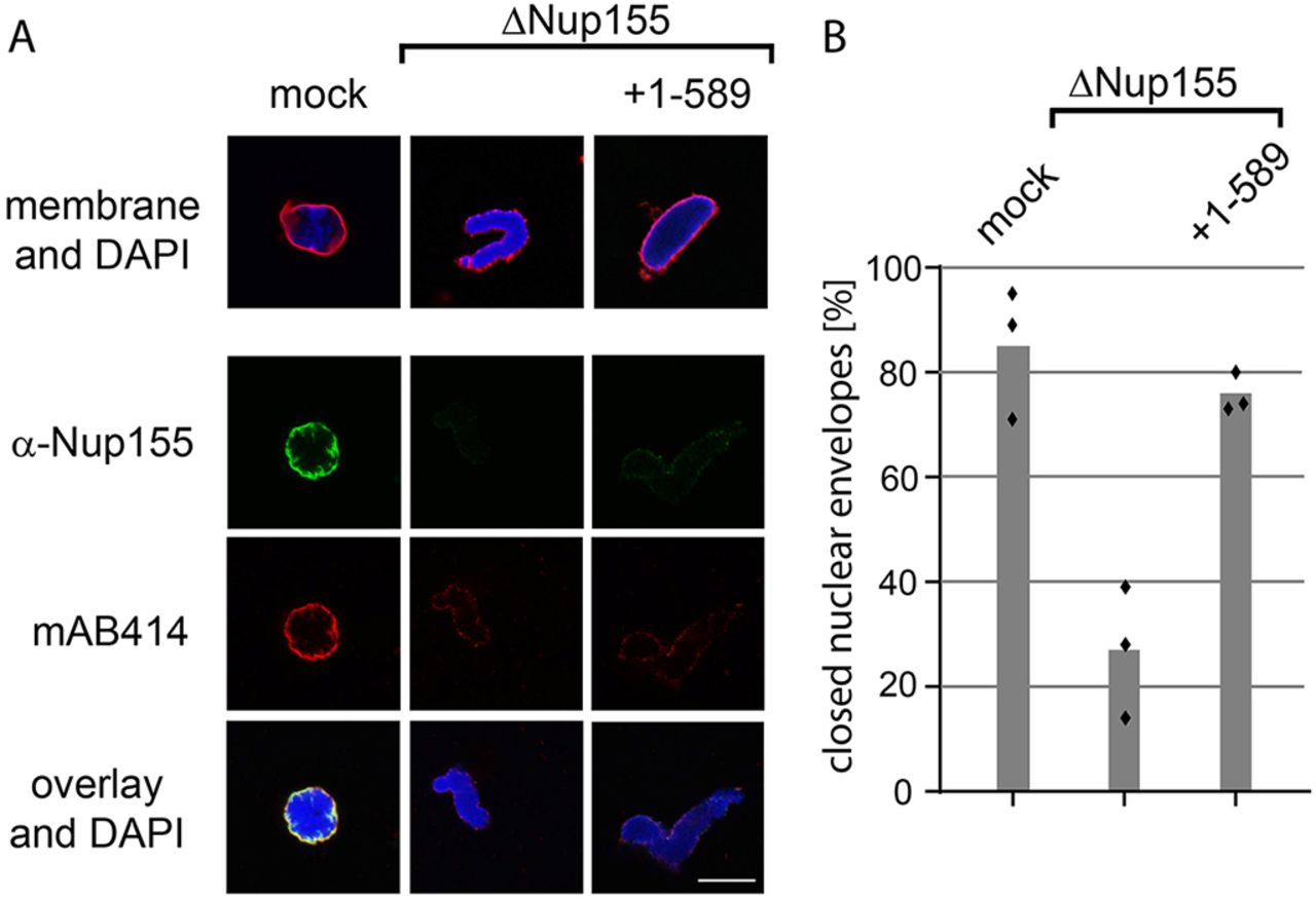 Fig.2. The Nup155 β-propeller region is sufficient for formation of a closed nuclear envelope. (A) Confocal microscopy images of nuclei assembled for 120â min in mock-depleted, Nup155-depleted (δNup155), and Nup155-depleted Xenopus egg extracts supplemented with 100â nM of the Nup155(1â589) fragment. Membranes have been pre-labelled with DiIC18 (red in overlay) and chromatin was stained with DAPI (blue in overlay). The bottom panels show the immunofluorescence analysis for Nup155 (green) and NPCs (mAB414, red) on the chromatin (DAPI, blue in overlay). Scale bar: 10â µm. (B) Average percentage of closed nuclear envelopes for 100 randomly chosen chromatin substrates in each of three independent experiments. Data points from the three individual experiments are indicated.