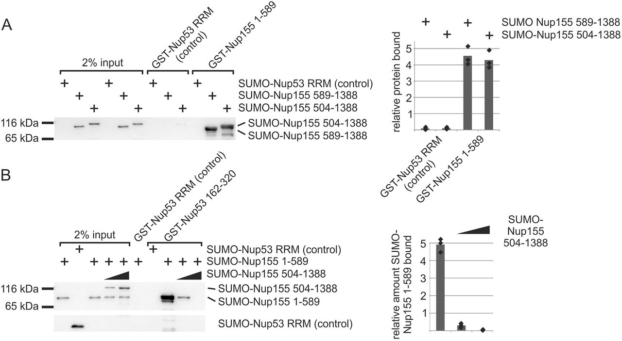 Fig.4. The C-terminal domain of Nup155 weakens the Nup53âNup155 interaction. (A) GST fusion constructs of the Xenopus Nup53 RRM domain (aa 162â267, control) or a Nup155 N-terminal fragment (aa 1â589) were incubated with the SUMO-tagged Nup53 RRM domain (aa 162â267, control) or two C-terminal Nup155 fragments (aa 589â1388 and aa 504â1388) at a final concentration of 0.5â µM of each protein, pulled down and analyzed by western blotting. The right panel shows the average of the SUMOâNup155 preys bound to GSTâcontrol or GSTâNup155(1â589) baits from three independent experiments. Data points from individual experiments are indicated. (B) 0.5â µM GST fusion constructs of the Xenopus Nup53(RRM) (control) or a C-terminal fragment (aa 162â320) were incubated with 0.5â µM SUMOâNup53(RRM) (control) or SUMOâNup155(1â589). Where indicated, SUMOâNup155(504â1388) was added in a twofold (1â µM) or sixfold (3â µM) excess over SUMOâNup155(1â589). The right panel shows the average of the SUMOâNup155(1â589) prey bound to GSTâNup53(162â320) bait in the absence or presence of a twofold and sixfold excess of SUMOâNup155(504â1388) from three independent experiments. Data points from individual experiments are indicated. Eluates and 2% of the input were analyzed by western blotting using an antibody against the 6ÃHis tag.