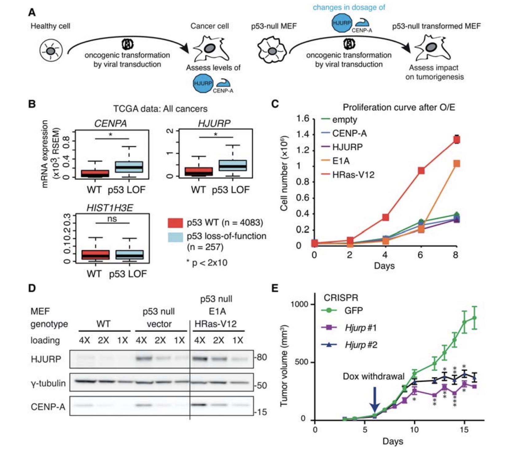 expression (mRNA) of genes coding for CENP-A (CENPA), HJURP (HJURP), and H3.1 (HIST1H3E) from all cancers (28 cancer types), classified according to p53 status (TCGA provisional data). Tumors are either wild type for TP53 (n = 4083) or p53 loss of function (LOF) (n = 257). Significance was computed using Wilcoxon rank sum tests. (C) HJURP or CENP-A overexpression alone does not transform p53-null MEFs. Proliferation curve of p53-null MEFs transduced with the indicated retroviral construct. The graph displays the quantified cell number ± SEM of triplicates. (D) HJURP and CENP-A are overexpressed in p53-null wild-type and transformed MEFs. Western blot of HJURP and CENP-A levels in RIPA-soluble extracts from MEFs transduced with empty vector or sequentially with E1A and HRas-V12. (E) Conditional depletion of exogenous HJURP stops the growth of established tumors lacking endogenous HJURP. Allograft assay measuring tumor growth following HJURP knockout over time. p53-null HRas-V12 MEFs were generated with an inducible CRISPR-resistant HJURP transgene maintained in the presence of doxycycline. Doxycycline was withdrawn on day 6 after injection (Hjurp switched off ) and allograft tumor volume was measured over time. Data represent mean tumor volume ± SEM. *, P < 0.05; **, P < 0.005; ***, P < 0.0005, t-test. (Adapted, with permission, from Filipescu et al. 2017.)