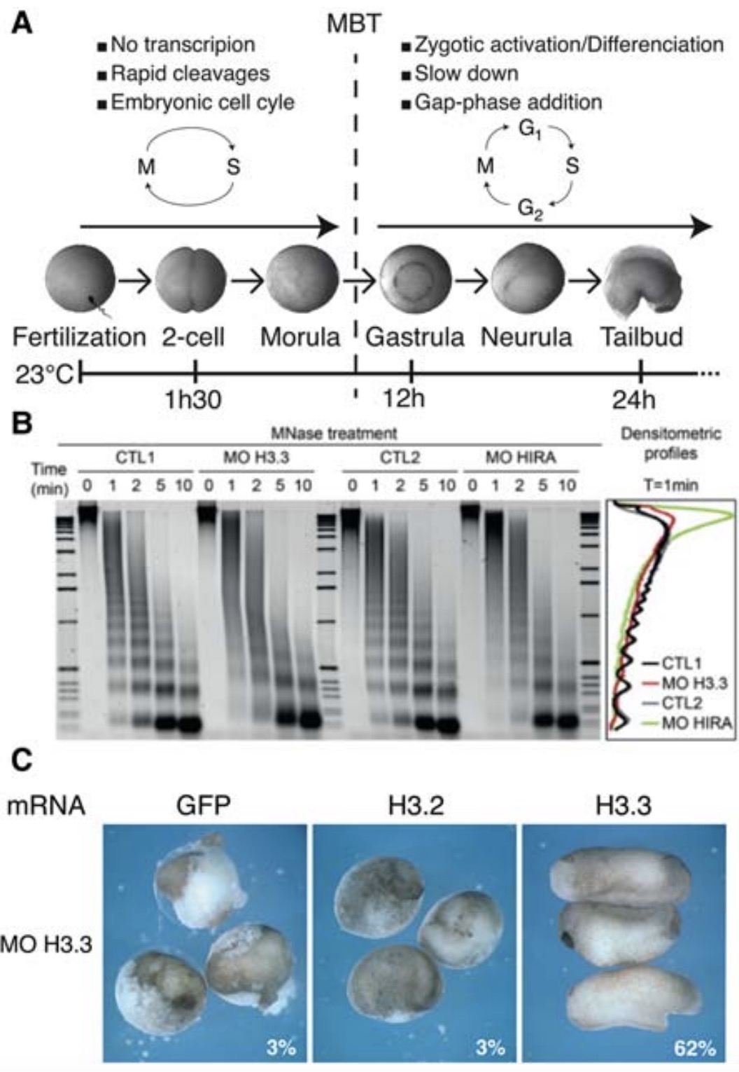 Figure 5. H3.3 plays a nonredundant role in Xenopus early development. (A) Well-characterized Xenopus laevis embryonic development provides a crucial window for studying chromatin. The embryo undergoes rapid synchronous cell divisions without any zygotic transcription until the midblastula transition (MBT). After the MBT, gap phases are introduced in the cell cycle along with the onset of zygotic transcription. (B) Chromatin disorganization upon depletion of a crucial brick (H3.3) or architect (HIRA). MNase digestion profile of H3.3 and HIRA morpholino (MO) injected embryos. Stage 14 embryos were used to prepare nuclei. For each time point of MNase digestion, purified DNA fragments were analyzed by agarose gel electrophoresis. Densitometric profiles of the 1-min digestion products are shown on the right (Szenker et al. 2012). (C) H3.2 expression does not rescue loss of H3.3 during Xenopus early development. H3.3 MO and indicated mRNAs were injected into two-cell stage embryos. Stage 25 embryos were used for image acquisition. Percentage viability of 30 embryos is shown. (Adapted from Szenker et al. 2012.)