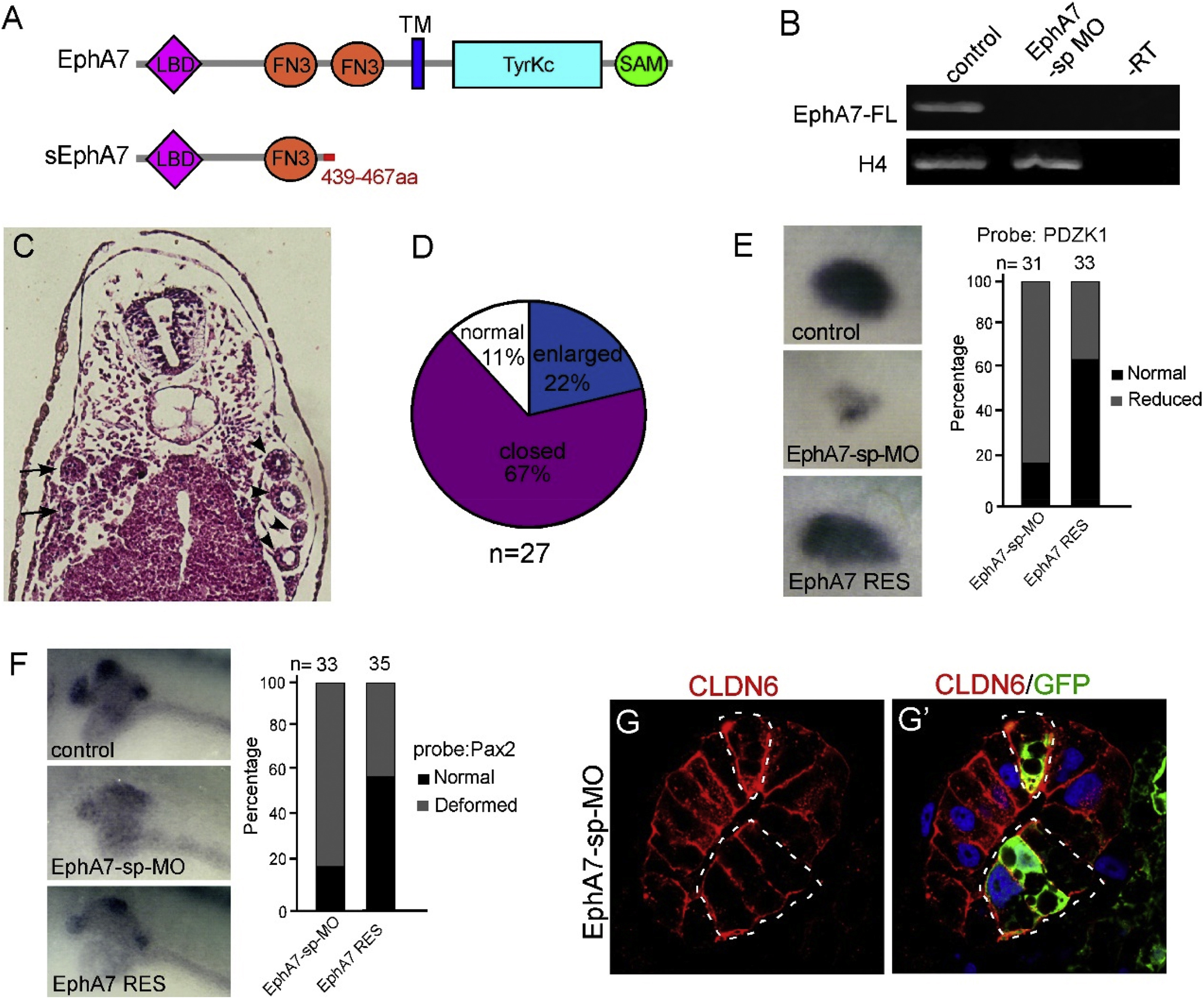 Fig. 3. A soluble form of EphA7 is involved in pronephros development. (A) Schematic representation of the structures of full length EphA7 and soluble EphA7 (sEphA7). LBD, ligand binding domain; FN3, fibronectin type III repeat; TM, transmembrane domain; TyrKc, tyrosine kinase domain; SAM, SAM domain. (B) Injection of the EphA7-sp-MO blocked the expression of the full length EphA7 (EphA7-FL). -RT, negative control without reverse transcriptase. H4, internal reference. (C) A transverse section of a stage 36 embryo showing closed pronephric tubules on the EphA7-sp-MO injected side (arrows on the left side) in contrast to the normal pronephric tubules on the control side (arrowheads on the right side). (D) Quantification of the effect of the EphA7-sp-MO on pronephric tubule lumen. (E, F) Whole-mount in situ hybridization using probes against Pax2 and PDZK1 in stage 36 embryos injected with EphA7-sp-MO or EphA7-sp-MO plus EphA7 mRNA (160 pg EphA7 rescue). The statistics are shown in the right panels. (G, Gâ²) Immunostaining of CLDN6 (red) on a section of a pronephric tubule of a stage 35 embryo injected with EphA7-sp-MO. The targeted areas labeled by tracing GFP (green) are outlined. (For interpretation of the references to colour in this figure legend, the reader is referred to the Web version of this article.)