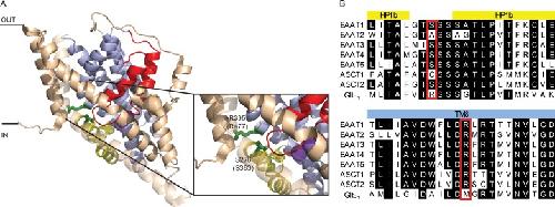 Figure 1. Structural conservation of an arginine residue at the interface of the transport domain and trimerization domain. (A) Cartoon representation of a locked R276S/M395R GltPh protomer in the plane of the membrane in the outward-facing occluded state (PDB accession no. 4X2S). The trimerization domain (TM1, TM2, TM4, and TM5) is colored in light brown, and the transport domain (TM3, TM6, TM7, TM8, HP1, and HP2) is colored in light blue, with HP1 and HP2 highlighted in yellow and red, respectively. In this mutant GltPh structure, the arginine has been moved from the native position of 276 to 395 to reflect the position of this positively charged residue in the EAATs. Residues 276 and 395 are shown in green stick representation and numbered according to GltPh positioning, with EAAT1 numbering provided in parentheses. Na+ ions are represented as purple spheres. Aspartate is not present in this structure. The figure was made using the software PyMOL (The PyMOL Molecular Graphics System, version 1.3r1; Schrödinger, LLC). (B) Amino acid alignment of HP1 and TM8 of the SLC1 family. R276/S363 and M395/R477 are outlined in red.