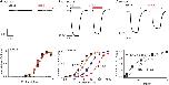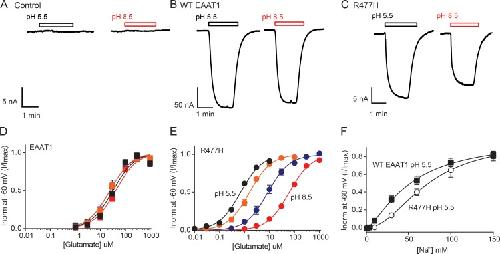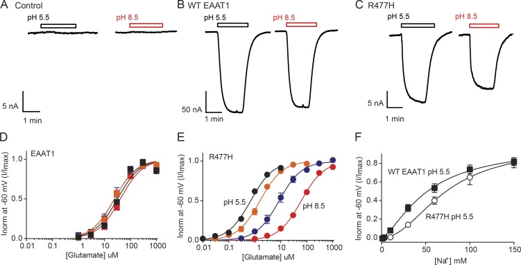 Figure 2. R477H presents strong pH dependence for apparent glutamate affinity. (AâC) Representative current traces elicited by K0.5 concentrations (see Table 1) of l-glutamate for control (uninjected oocytes; A), WT EAAT (B), and R477H (C) at pH 5.5 (black bars) and 8.5 (red bars). (D and E) l-Glutamate concentration responses for WT EAAT1 (D) and R477H (E) were conducted at â60 mV in ND96 at pH 5.5 (black), 6.5 (orange), 7.5 (blue), and 8.5 (red). (F) Na+ concentration responses were performed at â60 mV for WT EAAT1 (closed squares) and R477H (open circles) at pH 5.5 in the presence of 300 µM or 3 µM l-glutamate for WT EAAT1 or R477H, respectively. Choline+ was used as the substitute cation. Currents were normalized to the maximal current activated for each cell. Data shown represent the mean ± SEM (n ⥠3). Where error bars cannot be seen, they lie within the symbol.