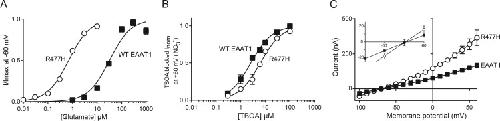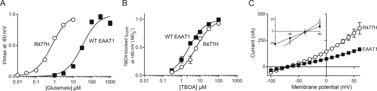 Figure 4. The substrate-binding site is unperturbed in R477H at pH 5.5. (A) Steady-state currents at 60 mV in the presence of increasing concentrations of the competitive blocker TBOA were measured in WT EAAT1 and the R477H mutant transporter at pH 5.5. These currents were then subtracted from currents in the absence of TBOA to measure the TBOA-dependent blockage of the Na+-activated anion conductance. Currents were normalized to the maximal current blocked by TBOA for each cell. (B) l-Glutamate concentration responses for WT EAAT1 (closed squares) and R477H (open circles) at pH 5.5 reproduced from Fig. 2 are provided for comparison with [TBOA] concentration responses. (C) Current-voltage relationships for WT EAAT1 (closed squares) and R477H (open circles) as blocked by 30 µM TBOA at pH 5.5. Data shown represent the mean ± SEM (n ⥠4). Where error bars cannot be seen, they lie within the symbol.