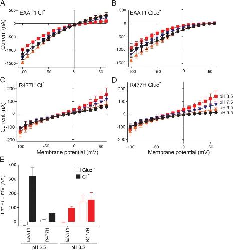 Figure 5. pH-dependent uncoupled cation fluxes through R477H. (AâD) Current-voltage relationships for WT EAAT1 and R477H elicited by submaximal l-glutamate in 96 mM Clâ-based buffer (A and C) and 96 mM gluconate-based buffer (B and D) at pH 5.5 (black circles), 6.5 (orange triangles), 7.5 (blue triangles), and 8.5 (red squares). (E) Current at 60 mV for WT EAAT1 and R477H at pH 5.5 (black) and 8.5 (red) in 96 mM gluconate-based buffer (open bars) and 96 mM Clâ-based buffer (closed bars). Data shown represent the mean ± SEM (n ⥠4). Where error bars cannot be seen, they lie within the symbol. Note the scale difference in the y axes.