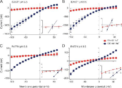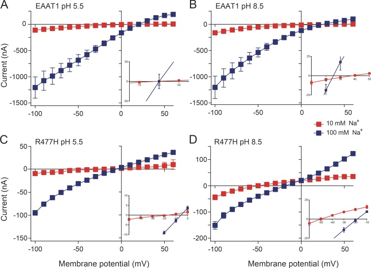 Figure 6. Na+ can permeate through R477H at pH 8.5. (AâD) Current-voltage relationships for WT EAAT1 and R477H elicited by submaximal l-glutamate in 10 mM (red squares) and 100 mM (blue squares) Na+-based buffers at pH 5.5 (A and C) and 8.5 (B and D). All buffers were osmotically balanced using choline+ as the substitute cation. Data shown represent the mean ± SEM (n ⥠4). Where error bars cannot be seen, they lie within the symbol. Note the scale difference in the y axes.