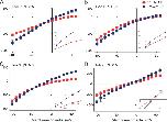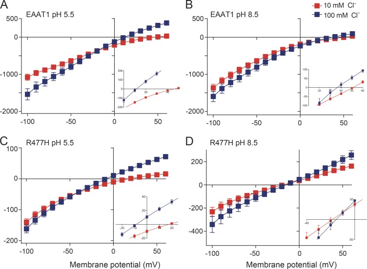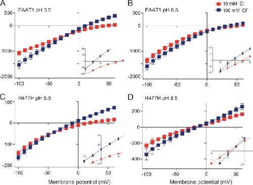Figure 7. Clâ cannot permeate through R477H at pH 8.5. (AâD) Current-voltage relationships for WT EAAT1 and R477H elicited by submaximal l-glutamate in 10 mM (red squares) and 100 mM (blue squares) Clâ-based buffers at pH 5.5 (A and C) and 8.5 (B and D). All buffers were osmotically balanced using gluconateâ as the substitute anion. Data shown represent the mean ± SEM (n ⥠4). Where error bars cannot be seen, they lie within the symbol. Note the scale difference in the y axes.