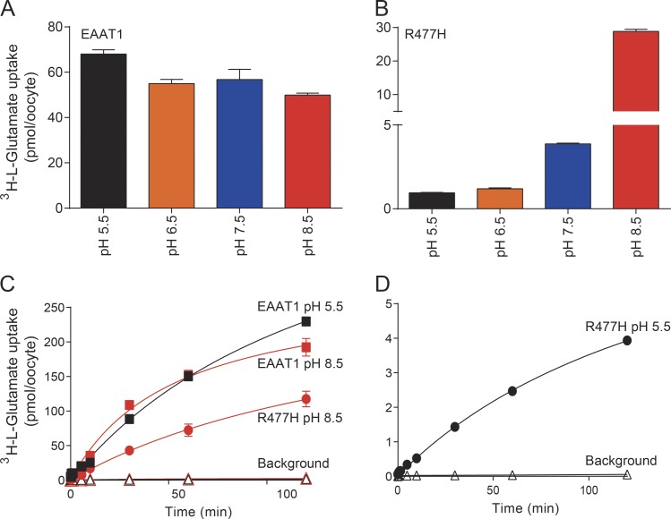 Figure 3. R477H presents strong pH dependence for substrate transport. Uptake of l-[3H]glutamate into oocytes expressing WT EAAT1 (A) and R477H (B) was measured at pH 5.5 (black), 6.5 (orange), 7.5 (blue), and 8.5 (red) over a course of 10 min. Oocytes expressing WT EAAT1 were incubated in 10 µM l-[3H]glutamate, and equivalent concentrations of l-[3H]glutamate were used for oocytes expressing R477H to account for the shifts in K0.5 for glutamate observed in this mutant transporter. See Materials and methods for further details. (C and D) Uptake of l-[3H]glutamate, into oocytes expressing WT EAAT1 (squares) and R477H (circles), was measured over a 120-min time period at pH 8.5 (red) and pH 5.5 (black). 10 µM l-[3H]glutamate was used for WT EAAT1 at both pH 5.5 and 8.5 and R477H at pH 8.5. 0.2 µM l-[3H]glutamate was used for R477H at pH 5.5 to account for differences in substrate affinity. (D) Uptake for l-[3H]glutamate into oocytes expressing R477H at pH 5.5 was lower than at pH 8.5 but is significantly above that of uninjected oocytes. A and B represent l-[3H]glutamate of WT EAAT1â and R477H-expressing oocytes; background uptake is presented in C and D. Background refers to l-[3H]glutamate uptake into uninjected oocytes for each condition. Data shown represent the mean ± SEM (n ⥠7). Where error bars cannot be seen, they lie within the symbol. Note the scale difference in the y axes.