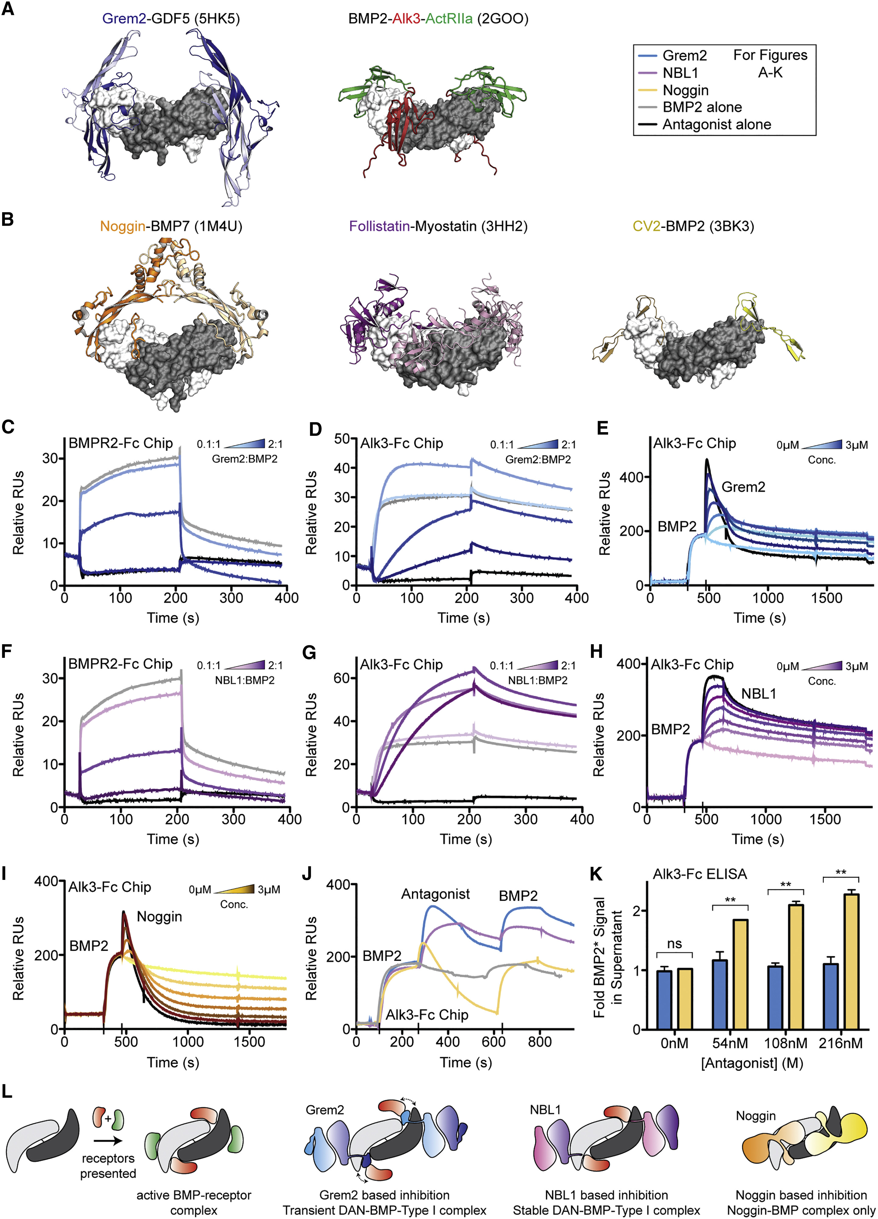 (K) ELISA binding assay using immobilized Alk3-Fc treated with labeled BMP2, washed, and then treated with Grem2 (blue) or Noggin (orange) at various concentrations for 1 hr. Fluorescence was measured in the supernatant to quantify BMP2 release from Alk3. Error bars indicate mean ± SEM. ∗∗p < 0.05 using Student’s t test; ns, not significant. All experiments were performed in triplicate.