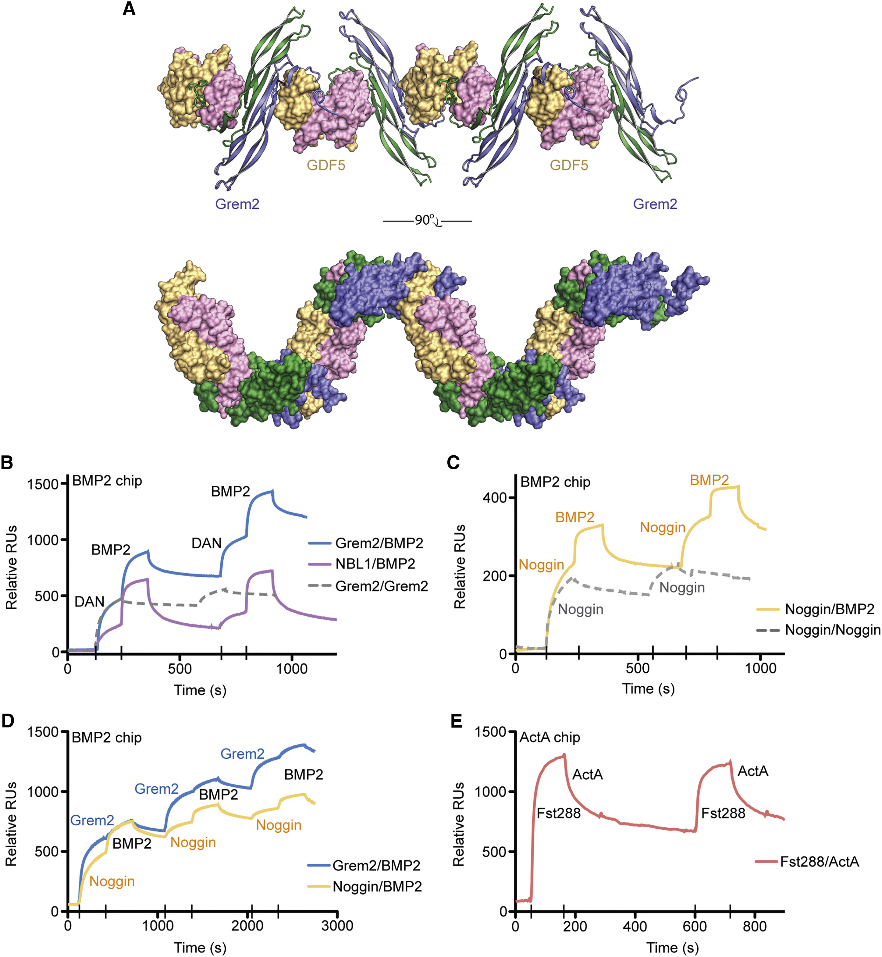 (A) Ribbon and surface representations of Grem2-GDF5 in a ligand-centric view. Grem2 (green, chain E; blue, chain F); GDF5 (pink, chain A; gold, chain C).