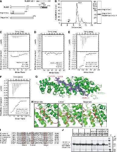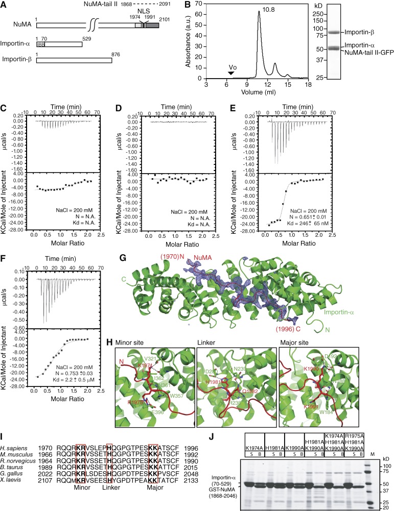 Figure 1. Biochemical and structural characterization of the heterotrimeric NuMA-tail II–Importin-α–Importin-β complex. (A) Domain structures of NuMA, Importin-α, and Importin-β. For NuMA, the microtubule-binding regions suggested by the Merdes and Mapelli groups are shown in light and dark gray, respectively (Haren and Merdes, 2002; Gallini et al., 2016). The NLS is colored black. Residue numbers of NuMA-tail II (dotted line) used in biochemical studies are indicated. For Importin-α, the Importin-β binding domain is indicated. (B) Purified recombinant Importin-α, Importin-β, and NuMA-tail II-GFP were mixed and analyzed by SEC. The peak fraction (10.8 ml) was analyzed by SDS-PAGE and stained with Coomassie blue. SEC (Superdex 200) elution profile for the NuMA-tail II-GFP–Importin-α–Importin-β trimeric complex. The void volume (Vo) of the peak fraction and absorbance (a.u.) at 280 nm for the complex is indicated. (C–F) ITC titration curves (top) and binding isotherms (bottom) of full-length Importin-α (C), full-length Importin-β (D), Importin-α (ΔIBB; E), and 1:1 stoichometric mixture of full-length Importin-α and -β with NuMA-tail II-GFP (F). (G) An omit difference (Fo-Fc) map contoured at 2.5 sigma with a superimposed atomic model of the NuMA (1955–2046)–Importin-α (70–498) complex, showing NuMA in red and Importin-α in green. Residues 1,970 to 1,996 in NuMA are assigned. (H) The three panels highlight the interactions at the minor site, linker region, and major site. (I) Sequence alignment of the NuMA-NLS peptide from different species (numbers represent amino acid positions). The conserved minor-site, linker-region and major-site interacting residues are highlighted by red boxes. (J) GST pull-down assays of Importin-α (70–529) with NuMA-tail mutants. GST-fused NuMA-tail (1,868–2,046) mutants were incubated with recombinant Importin-α. Unbound (S) and bound (B) samples were analyzed by SDS-PAGE and stained with Coomassie blue.