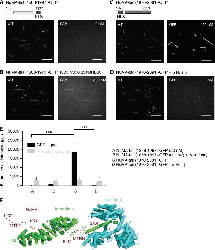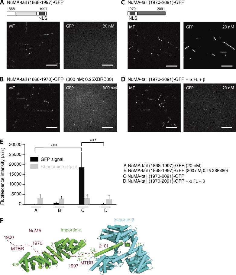 Figure 4. Importin-β regulates the microtubule-binding region that lies C-terminal to the NuMA NLS. GMPCPP-stabilized microtubules (X-rhodamine– and biotin-labeled) were incubated with NuMA-tail (1868–1997) and NuMA-tail (1970–2091) that contain microtubule-binding regions (light and dark gray) and NLS (black). (A and B) 20 nM and 800 nM of NuMA-tail (1868–1997) —GFP were examined under conditions of 1XBRB80 (A) and 0.25XBRB80 (B), respectively. (C and D) 20 nM of NuMA-tail (1970–2091)—GFP in the absence (C) or presence (D) of Importin-α/-β was analyzed. Bars, 10 µm. (E) Mean fluorescence signals under the different conditions shown in A–D were measured and plotted (n = 200 microtubules for each condition). SD was determined from data pooled from three independent experiments. Two-tailed Student t test; statistical differences: ***, P < 0.001. (F) The microtubule-binding region that lies C-terminal to the NLS (aa 1997–2101; brown dotted line) in NuMA is sterically blocked by Importin-β (light blue) that binds to the IBB domain of Importin-α (green; PDB code: 1QGK). Two microtubule-binding regions (MTBRs) are indicated.