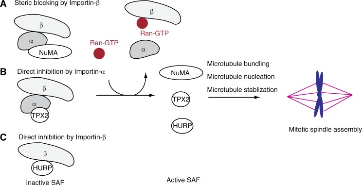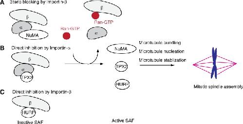 Figure 5. Schematic for how Ran–GTP regulates SAF activities required for mitotic spindle assembly. SAFs (e.g., NuMA, TPX2, and HURP) are suppressed by the Ran-governed transport factors Importin-α and -β. Ran–GTP modulates interaction between Importins and SAFs. Free SAFs that regulate distinct microtubule behaviors control organization of the mitotic spindle.