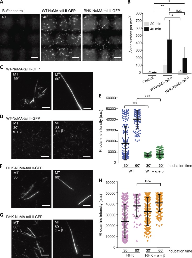 Figure 2. Importin-α/-β regulates NuMA-tail II-mediated higher-order microtubule structure assembly. (A) Microtubule aster assembly in Xenopus egg extracts, examined with buffer control (left), WT NuMA-tail II-GFP (5 µM, center), and RHK-NuMA-tail II-GFP (5 µM, right) after 40-min incubation at 18°C. Microtubules were imaged using X-rhodamine tubulin (100 nM). Large representative images were created with 3×3 raster scan images. Bars, 100 µm. (B) Dependency of aster assembly activity on NuMA. The number of microtubule asters was counted in microtubule images at indicated incubation times. Data are mean ± SD from n = 6 trials, performed using three independent extract preparations (10 ± 9, 109 ± 76, and 21 ± 14 at 20 min; 12 ± 10, 445 ± 256, and 194 ± 152 at 40 min; for control, WT, and RHK mutant, respectively). (C–H) GMPCPP-stabilized microtubules (X-rhodamine–labeled) were incubated separately with equal concentrations (400 nM) of WT-tail II-GFP (C and D) and RHK-tail II-GFP (F and G) in the presence or absence of Importin-α and Importin-β (4 µM each). Samples were fixed and processed to determine rhodamine fluorescence intensity after 30 and 60 min incubation. Bars, 10 µm. (E and H) Rhodamine intensity of microtubules for each condition was analyzed and plotted. SD was determined from data pooled from three independent experiments (E: WT, 30′, n = 180; WT+α+β, 30′, n = 153; WT, 60′, n = 100; WT+α+β, 60′, n = 147. H: RHK, 30′, n = 180; RHK+α+β, 30′, n = 180; RHK, 60′, n = 55; RHK+α+β, 60′, n = 147). Two-tailed Student t test for comparison of 30 min incubation; Mann-Whitney U test for comparison of 60 min incubation. Statistical differences: *, P < 0.05; **, P < 0.01; ***, P < 0.001; n.s., not significant.