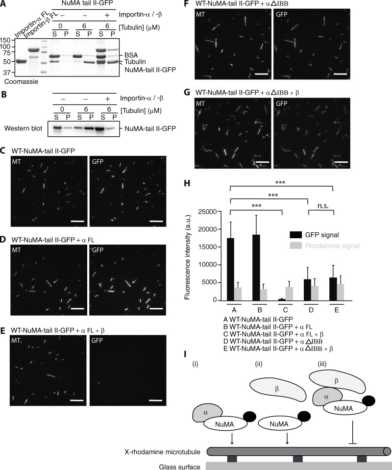 Figure 3. Importin-β regulates interaction of NuMA-tail II with microtubules. (A) SDS-PAGE analysis of microtubule cosedimentation assays for NuMA-tail II-GFP in the presence of Importin-α or Importin-α/-β. BSA (final, 0.25 mg/ml), which was used to suppress nonspecific interactions, and tubulin concentrations are indicated. Supernatant and pellet fractions are indicated as S and P, respectively. FL, full length. (B) The NuMA-tail II-GFP bands in the gel shown in A were detected by Western blot using anti-GFP antibody as the positions of NuMA-tail II-GFP and tubulin overlap. (C–G) GMPCPP-stabilized microtubules (X-rhodamine– and biotin-labeled), immobilized on a glass surface, were incubated with WT-NuMA-tail II-GFP (C) in the presence of full-length Importin-α (D), full-length Importin-α and Importin-β (E), Importin-α (ΔIBB; F), and Importin-α (ΔIBB) and full-length Importin-β (G). Bars, 10 µm. (H) Analysis of NuMA (GFP) and microtubule (X-rhodamine) fluorescence signals. Mean fluorescence signals under the different conditions shown in C–G were measured and plotted. SD was determined from data pooled from three independent experiments (n = 200 microtubules for each condition). Two-tailed Student t test; statistical differences: ***, P < 0.001; n.s., not significant. (I) A summary of microtubule binding of NuMA-tail II in the presence of Importin-α/-β. X-rhodamine–labeled microtubules were immobilized on the glass surface and NuMA-tail II-GFP (indicated as NuMA; GFP is shown as a black dot) in the presence of Importin-α and Importin-β was imaged using TIRF microscopy.