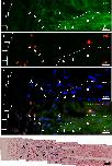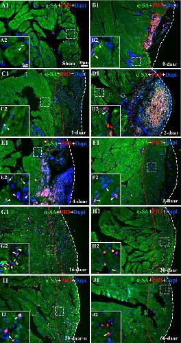 Fig. 5. α-SA/PH3 positive cells exist in the border area of the amputated site and regenerated area. a1 Longitudinal section of the apical area from a sham control. High magnification of the square region is shown (a2). Longitudinal sections of an amputated heart at 0 daar (b1, b2), 1 daar (c1, c2), 2 daar (d1, d2), 4 daar (e1, e2), 8 daar (f1, f2), 16 daar (g1, g2), 30 daar (h1, h2; perfect regeneration), 30 daar (i1, i2; nearly perfect regeneration), and 60 daar (j1; perfect regeneration). The amputated apex was regenerated by newly cardiomyocytes within approximately 30 days after amputation, as demonstrated by the presence of many α-SA+ cardiomyocytes in the regenerated zone (area between the red dotted line and white dotted line). In addition, the density of α-SA+/PH3+ cardiac myocytes in the border area of the regenerated zone at 2â8 daar and in the regenerated zone at 16â30 daar is significantly higher than those in the sham control and in 0â2 daar groups, suggesting that the proliferation of endogenous cardiomyocytes in the border area of the amputated site might be an important mechanism for regeneration of the damaged myocardium. α-SA alpha skeletal muscle actin, PH3 phospho-histone H3, DAPI 4â²,6-diamidino-2-phenylindole. White arrow: PH3+ nucleus. White dotted line, outer surface of the epicardium. Area between the red dotted line and white dotted line, regenerated area after amputation. 30-daar-n: amputated heart with nearly perfect regeneration at 30 daar. Bar in a1âj1 = 50 μm. Bar in a2âj2 = 10 μm. Six frogs were inspected for 30 and 60 daar, while three frogs were inspected for other time points respectively