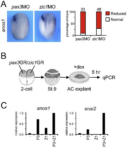 Fig. 2. anos1 is a target of Pax3 and Zic1. (A) Injection of pax3MO (40â¯ng) or zic1MO (40â¯ng) reduces anos1 expression at the neurula stage. Dorsal views, anterior to top. The injected side is to the right as indicated by the presence of the lineage tracer (Red-Gal). The graph indicates the percentage of embryos with normal (white) or reduced/lost (red) anos1 expression. The number of embryos analyzed is indicated on top of each bar. (B) mRNA encoding pax3GR and zic1GR (100 pg each), alone or in combination were injected into both blastomeres in the animal pole at the 2-cell stage. At the blastula stage (stage 9), animal cap (AC) explants were dissected and cultured for 8 h in the presence of dexamethasone (+dex). (C) anos1 and snai2 expression in pax3GR and zic1GR injected AC explants analyzed by qRT-PCR.