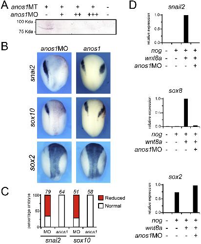 Fig. 3. Anos1 is required for neural crest formation. (A) Western blot of embryos injected with mRNA encoding a myc-tagged version of Xenopus anos1, alone or in combination with increasing doses of anos1MO, 10 ng (+), 20 ng (++), and 40 ng (+++), showed that anos1MO blocks Anos1 protein accumulation. (B) Unilateral injection of anos1MO (40â¯ng) at the 2-cell stage causes a reduction/loss of expression of snail2 and sox10, and a lateral expansion of sox2 expression domain. Injection of Xenopus anos1 mRNAs (3â¯ng) did not significantly affect snail2 and sox10 expression levels, although their expression domain was shifted laterally. The expression of sox2 was only marginally expanded in these embryos. Dorsal views, anterior to top. The injected side is to the right (Red-Gal). (C) The graphs indicate the percentage of embryos with normal (white), reduced/lost (red) expression. The number of embryos analyzed is indicated on top of each bar. (D) In explants, the induction of snail2 and sox8 by co-injection of noggin (200â¯pg) and wnt8a (10â¯pg) mRNA is dramatically reduced in the context of embryos injected with anos1MO (40â¯ng). This reduction in neural crest genes expression is associated by an increase in sox2 expression. The values were normalized to ef1α. A representative experiments is shown from three independent experiments. (For interpretation of the references to colour in this figure legend, the reader is referred to the Web version of this article.)