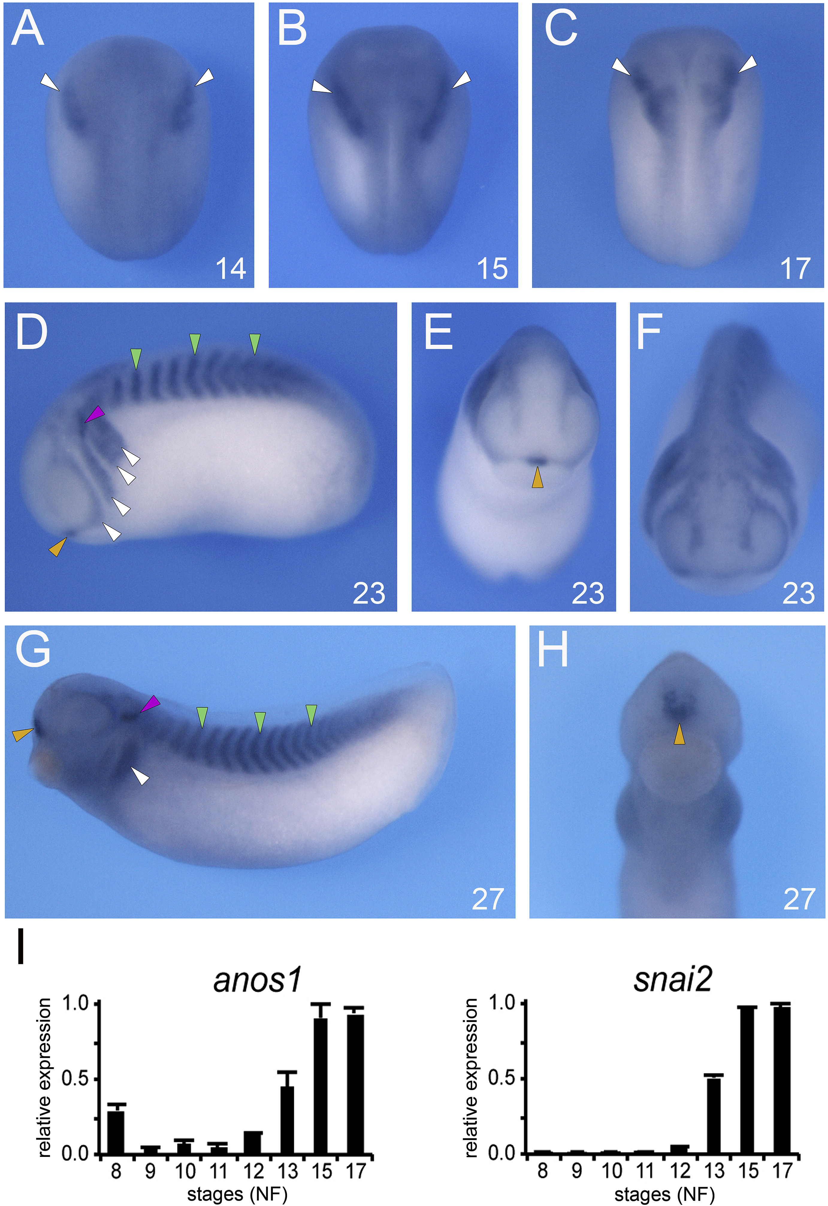 Fig. 1. Developmental expression of anos1 by whole-mount ISH. (AâC) At the neurula stage (NF stage 14â17), anos1 is detected in the prospective neural crest territory (white arrowheads). (DâF) At stage 23, anos1 is now more broadly expressed, to include the somites (green arrowheads), otic vesicle (red arrowhead), the anteriorpituitary (yellow arrowhead) in addition to the branchial arches (white arrowheads). (GâH) Later in development (NF stage 27) anos1 persists in all these tissues. (AâC) dorsal views, anterior to top. (D, G) lateral views, dorsal to top, anterior to left. (E, F, H) frontal views, dorsal to top. The embryonic stages (NF) are indicated in the lower right corner of each panel. (I) Relative expression levels of anos1 and snail2 analyzed by qRT-PCR at the indicated stages. The values were normalized to odc1. (For interpretation of the references to colour in this figure legend, the reader is referred to the Web version of this article.)
