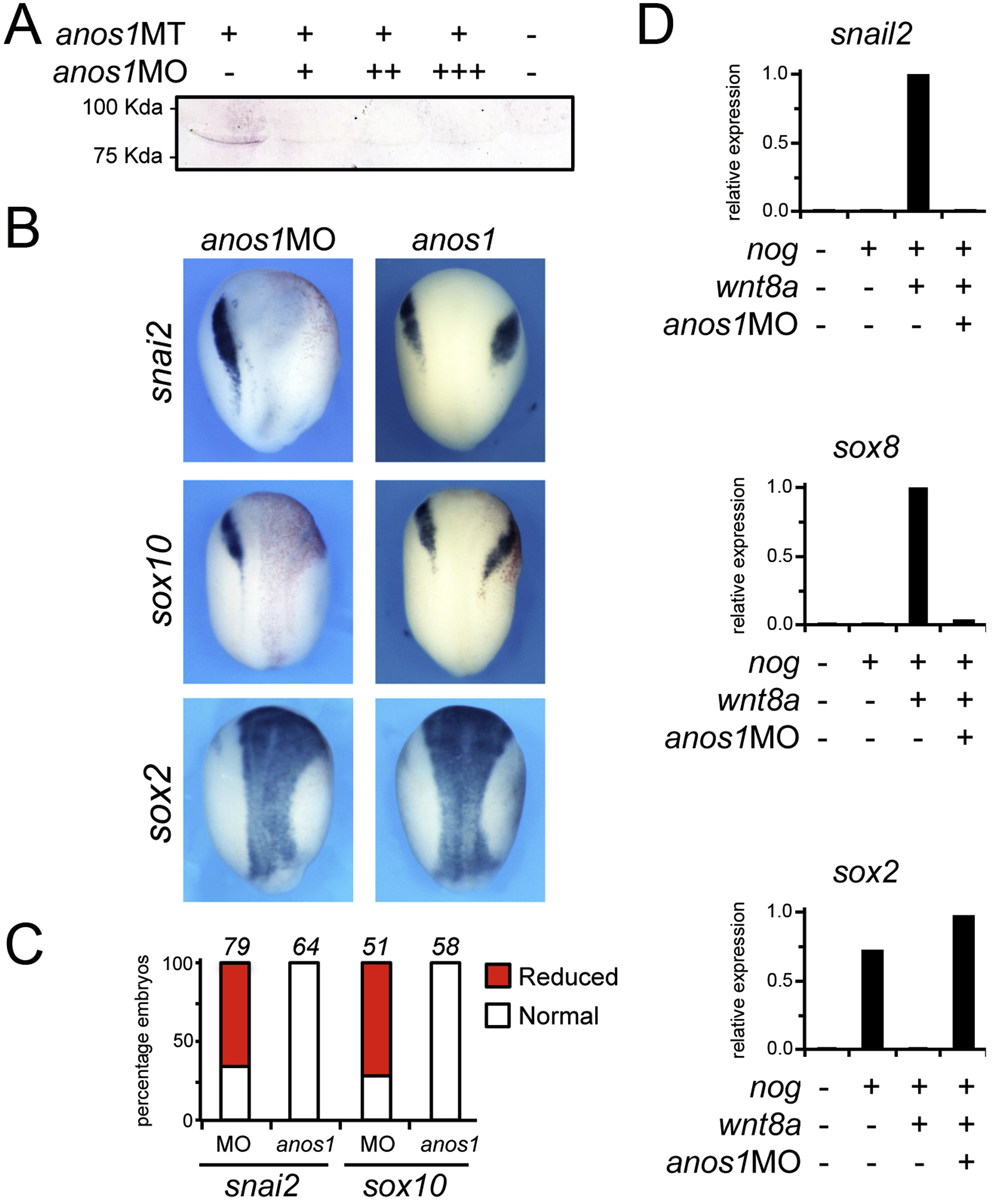 Fig. 3. Anos1 is required for neural crest formation. (A) Western blot of embryos injected with mRNA encoding a myc-tagged version of Xenopus anos1, alone or in combination with increasing doses of anos1MO, 10 ng (+), 20 ng (++), and 40 ng (+++), showed that anos1MO blocks Anos1 protein accumulation. (B) Unilateral injection of anos1MO (40â¯ng) at the 2-cell stage causes a reduction/loss of expression of snail2 and sox10, and a lateral expansion of sox2 expression domain. Injection of Xenopus anos1 mRNAs (3â¯ng) did not significantly affect snail2 and sox10 expression levels, although their expression domain was shifted laterally. The expression of sox2 was only marginally expanded in these embryos. Dorsal views, anterior to top. The injected side is to the right (Red-Gal). (C) The graphs indicate the percentage of embryos with normal (white), reduced/lost (red) expression. The number of embryos analyzed is indicated on top of each bar. (D) In explants, the induction of snail2 and sox8 by co-injection of noggin (200â¯pg) and wnt8a (10â¯pg) mRNA is dramatically reduced in the context of embryos injected with anos1MO (40â¯ng). This reduction in neural crest genes expression is associated by an increase in sox2 expression. The values were normalized to ef1α. A representative experiments is shown from three independent experiments. (For interpretation of the references to colour in this figure legend, the reader is referred to the Web version of this article.)