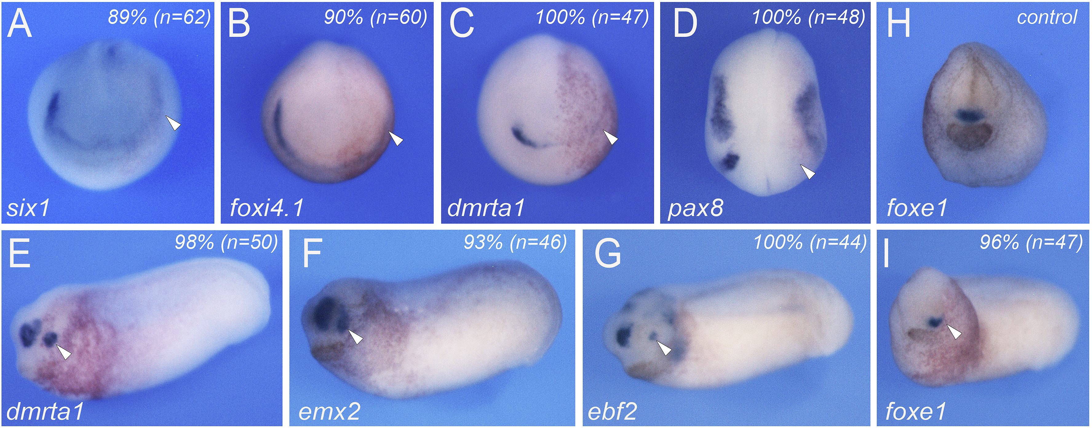 Fig. 4. Anos1 is essential for the formation of cranial placodes and their derivatives. (AâD) Unilateral injection of anos1MO (40â¯ng) at the 2-cell stage causes a reduction/loss of expression of two pan-placodal genes, six1 (A) and foxi4.1 (B), as well as genes restricted to individual placodal domains such as dmrta1 (C) and pax8 (D). (EâG) Later in development, the injected embryos exhibited reduce dmrta1 (E), emx2 (F) and ebf2 (G) expression in the olfactory epithelium. (HâI) The expression of foxe1 in the developing pituitary was also reduced (I) as compared to sibling control (H). (AâI) Anterior views, dorsal to top. The injected side (arrowheads) is to the right. The percentage of affected embryos is indicated in the upper right corner of each panel.