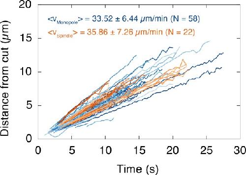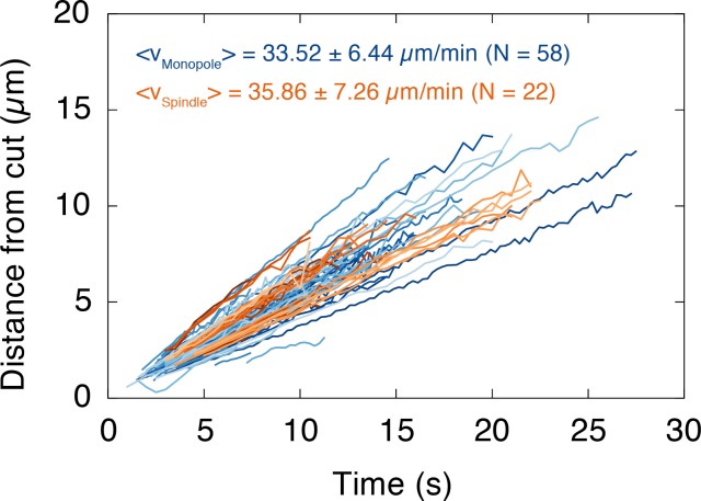 Figure 1—figure supplement 2. The depolymerization velocity of microtubules in monopolar spindles is indistinguishable from the one in spindles.We plotted the position of the depolymerization wave after a cut, which was determined by the maximum of the fitted Gaussians, over time. Each line corresponds to one wave (i.e. one cut). Data for monopoles and spindles are shown in blue and orange, respectively. The slope of each dataset corresponds to the depolymerization velocity of the cut microtubules (mean depolymerization velocity ± SD, Nmonopole = 58, Nspindle = 22).