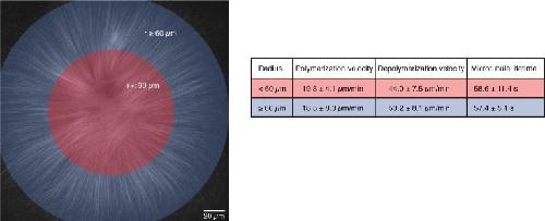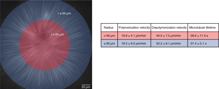 Figure 3—figure supplement 2. Microtubule dynamics are the same within the entire MCAK-inhibited monopolar spindle.We compared microtubule dynamics in the inner (radius < 60 m) and outer regions (radius ≥ 60 m) of MCAK-inhibited monopolar spindles. Polymerization velocities were measured by analyzing the speed of EB1-GFP comets in each region (N = 14 for each region, in three different structures from different reactions on the same extract day). Depolymerization velocities were calculated from laser ablation experiments on many different days (N = 55 cuts for the inner region and N = 13 cuts for the outer region). We used single tubulin speckle microscopy to measure the average lifetimes of microtubules (1455 speckles for the inner region and 3418 speckles for the outer region in the same structure). All values are given as mean ± SD.