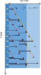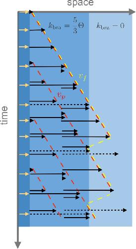 Figure 4—figure supplement 1. Example of the spatio-temporal evolution of autocatalytic microtubule nucleation with spatially varying branching nucleation rate kbra, polymerization velocity vp and turnover rate Θ.The yellow arrows at the origin denote initial microtubule seeds. In the example, a region has a branching rate of kbra=5Θ/3 and another region has vanishing branching rate. Microtubule turnover is shown as a transition from black to dashed black arrows and disappearance. The front velocity vf is denoted in yellow while the plus-end microtubule velocity is denoted in red. As shown in the figure, before the front reaches the boundary where branching is allowed, vp=vf; however, further away vf=0.