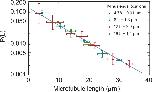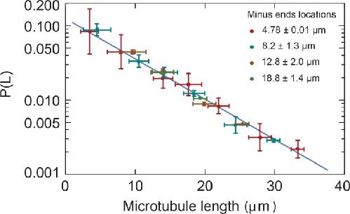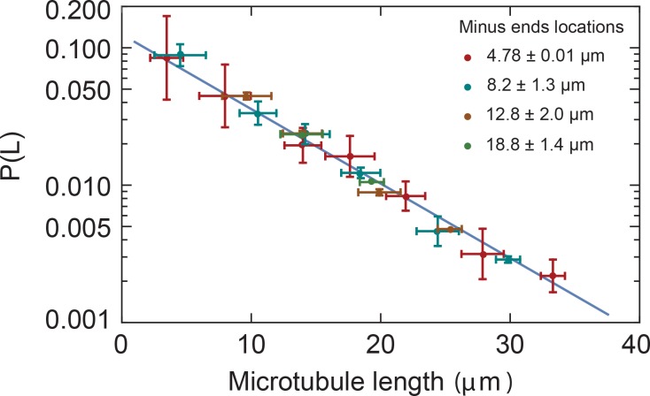 Figure 2—figure supplement 1. Microtubule length distributions are independent of the position in monopoles.Microtubule length distributions measured from minus ends at locations 4.78 ± 0.01 µm, 8.2 ± 1.3 µm, 12.8 ± 2.0 µm, and 18.8 ± 1.4 µm from the center of the monopole (mean ± SD). The solid line corresponds to the exponential fit to the monopole data from Figure 2B.