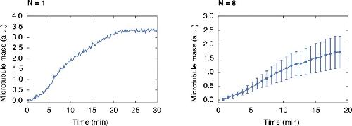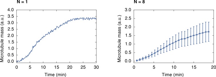 Figure 3—figure supplement 1. Growth of a monopolar spindle.Integrated fluorescence intensity of z-stacks of a microtubule structure labeled with 150 nM Atto565-tubulin growing around frog sperm over time (left). The right side shows the average of 8 structures (mean ± SD).