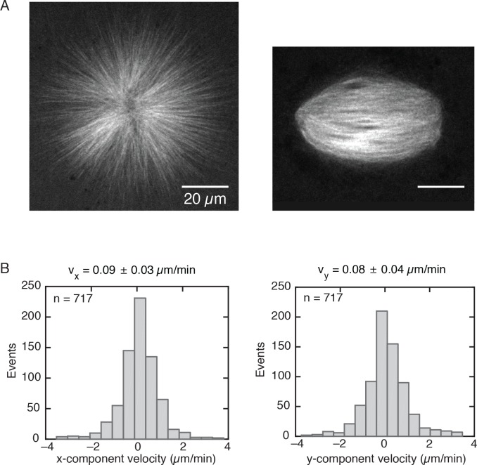Figure 1—figure supplement 1. Monopolar spindles have a similar size as regular spindles.(A) Left, monopolar spindle assembled with 200 µM STLC and labeled with 150 nM atto-565 tubulin. Right, regular spindle. (B) Velocity distributions of speckles in a monopole obtained by analyzing three different regions from Video 2 (n = 717 speckles total). The velocity distributions correspond to the x and y-components given a cartesian reference frame. The x and y velocity components of a speckle trajectory were computed as the difference between the final and initial position of the speckle along a given component, divided by the total speckle lifetime. The mean speckle velocities along each component are vx = 0.09 ± 0.03 µm/min and vy = 0.08 ± 0.04 µm/min (mean ± SDM). The average modulus of the speckle velocity is v = 0.12 ± 0.07 µm/min.