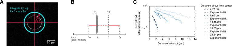 Figure 1—figure supplement 3. Depolymerization wave of microtubules cut by laser ablation.(A) Coordinate system for plotting differential intensities. Differential intensities I(x,ϕ), where x is the distance from the center of the monopole and ϕ is the angular coordinate, were integrated over ϕ(0<ϕ≤2π) for each value of x. The origin of the polar coordinate system was always set to be in the center of the monopolar spindle. Next, we plotted the integrated differential intensities as a function of x for each time point of the differential intensity movie (see Figure 1C). (B) Definitions of the variables used in the cutting method: xm, xp are the locations of minus/plus-ends with respect to the center of the monopole, r is the radius of the cut, vd is the depolymerization velocity, and y is the position of the depolymerization front with respect to the center of the monopole. (C) The log-linear plot shows the normalized integrated areas of the Gaussian fits (Figure 1C) as a function of the distance that the wave travels away from the cut, given cuts performed at different locations (the lighter the color the further was the cut from the monopole center). Dashed lines represent linear fits to the log-linear data normalized such that the interception with the y-axis equals unity.