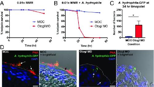 Fig. 4. Otogl morphants are sensitive to infection with A. hydrophila. (A) Survival time course of MOC-injected and Otogl MO-injected tadpoles in 0.01à Marcâs Modified Ringerâs (MMR). (B) Survival time course of MOC-injected and Otogl MO-injected tadpoles in 0.01à MMR containing 1.5 à 108 cfu/mL of A. hydrophila (at time point 0 h). Individual points represent mean survival levels from three independent experiments, and error bars represent the SEM. (C) Bar chart comparing the frequency of GFP-expressing A. hydrophila bacteria located within the tadpole in MOC- and Otogl MO-injected tadpoles fixed and sectioned at the 34-h time point. Bars represent mean number of bacteria found within MOC (n = 3 tadpoles)- and Otogl MO (n = 5 tadpoles)-injected tadpoles. Error bars represent SEM and P = 0.0179 (one-tailed MannâWhitney U test). (D) Representative images of sections of MOC- and Otogl MO-injected tadpoles following exposure to GFP-expressing A. hydrophila bacteria at the 34-h time point. The white line on the Left image represents the apical surface membrane from brightfield images (Right). (Scale bar: 10 μm.)