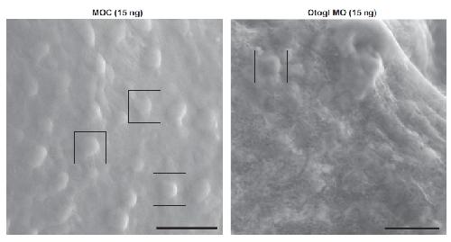 Otogl MO-injected tadpoles. The boxes highlight globular features that are more abundant in MOC- than in Otogl MO-injected tadpoles. (Scale bar: 50 μm.)