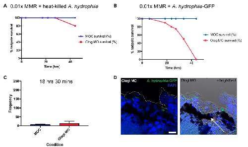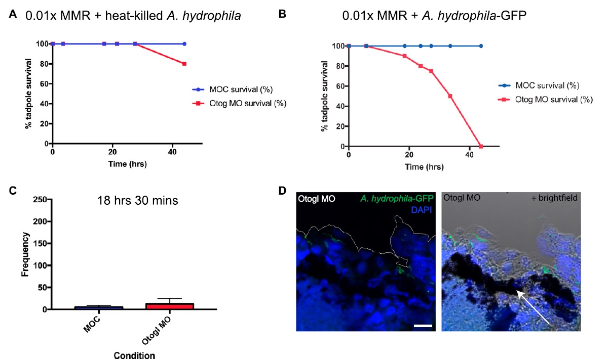 Otogl MO-injected tadpoles in 0.01Ã MMR containing 1.5 Ã 108 cfu/mL of GFP-expressing A. hydrophila (at time point 0 h). (C) Chart showing frequency of