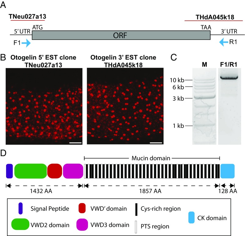 Fig. 1. Otogl is a large protein with mucin-like domains. (A) Model of Otogl transcript showing sites corresponding to EST clones TNeu027a13 and THdA045k18, as well as 5â² and 3â² UTRs, start (ATG) and stop (TAA) codons, and primer sites (F1 and R1). (B) RNA in situ hybridization expression patterns of TNeu027a13 and THdA045k18. (Scale bar: 100 μm.) (C) PCR using F1-R1 primers on X. tropicalis cDNA. âMâ is marker DNA ladder. (D) Predicted domains of Otogl. VWD is von Willebrand factor type D domain. The mucin domain shows the 39 Cys-rich and 34 PTS-rich subdomains. CK, cysteine knot domain. The size of the domains in numbers of amino acids (AA) is shown.