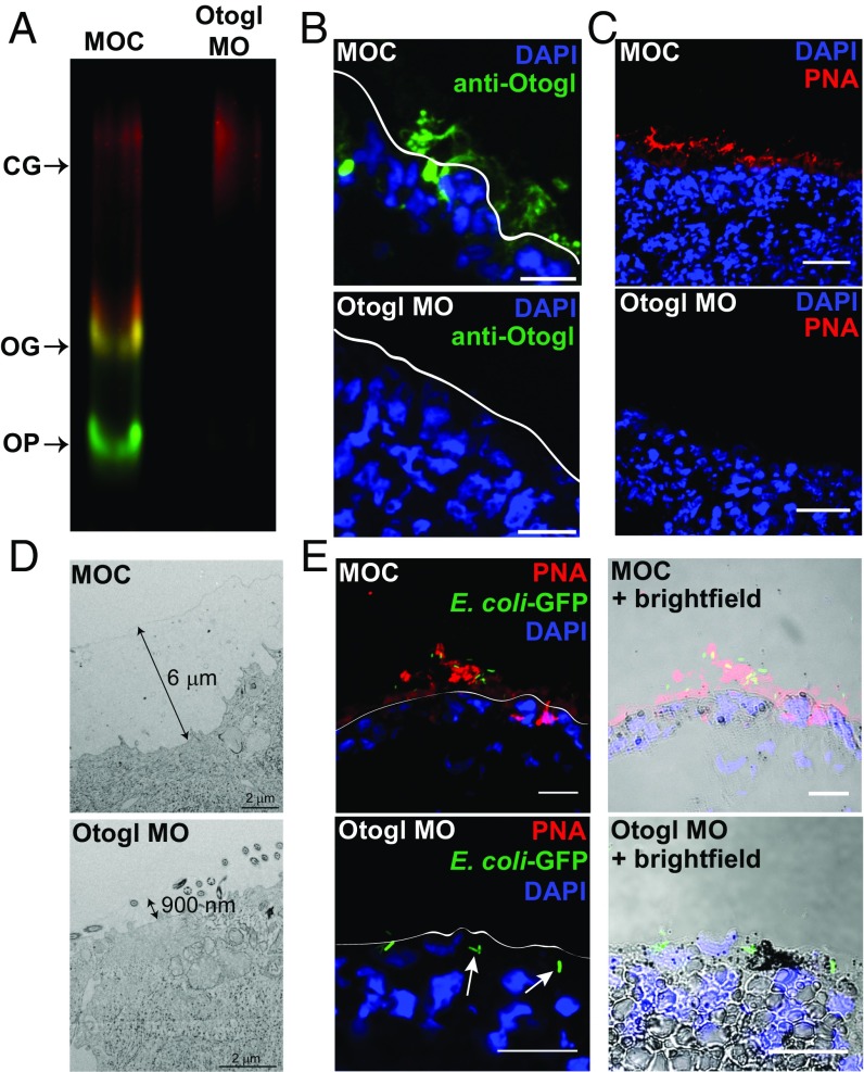 Fig. 3. Otogl forms a host-protective barrier on the epidermal surface. (A) Western blot of lysate from MOC- and Otogl MO-injected tadpoles, coprobing with the anti-Otogl antibody (green) and PNA (red), shows loss of Otogl protein upon knockdown. Glycosylated (OG) and precursor (OP) forms of Otogl are highlighted, while the similar intensity of signal for the cement gland mucin (CG) in the two lanes indicates equivalent loading of lysate. (B) Representative examples of sections from snap-frozen MOC- and Otogl MO-injected tadpoles stained with anti-Otogl antibody and DAPI. (Scale bar: 25 μm.) (C) Representative examples of sections from snap-frozen control MOC- and Otogl MO-injected tadpoles stained with PNA and DAPI. (Scale bar: 40 μm.) (D) Representative Cryo-TEM images of sections of snap-frozen MOC- and Otogl MO-injected tadpoles. Double-headed arrows show size of surface barrier. (Scale bar: 2 μm.) (E) Representative images of sections of MOC- and Otogl MO-injected tadpoles following exposure to GFP-expressing DH5α E. coli bacteria. White lines on images to the Left represent the apical surface membrane from brightfield images (Right). (Scale bar: 25 μm.)