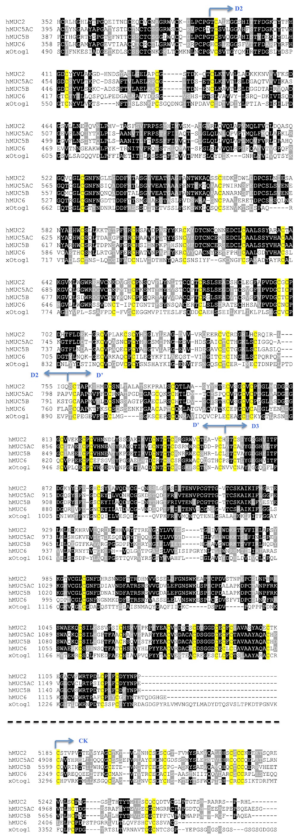 There is 30% identity of human MUC5B and Otogl in the CK domain (45% similarity), with complete conservation of the position of cysteine residues. D2, D′,