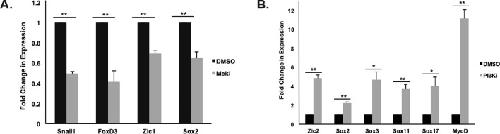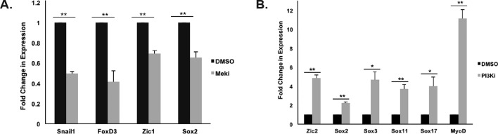 Figure 5—figure supplement 2. Blocking MAPK or PI3K activation differentially alters animal pole explant gene expression (A–B) qRT-PCR analysis of animal cap explants treated with Meki (RDEA119) and cultured alongside sibling embryos collected at blastula stages (stage 9) (A) or treated with PI3Ki (LY294) and cultured alongside sibling embryos collected at early neurula stages (stage 13) (B).Blocking MAPK activation inhibits Snail1, FoxD3, Zic1, and Sox2 expression while blocking PI3K activation increases Zic2, Sox2, Sox3, Sox11, Sox17, and MyoD expression. (*p<0.05; **p<0.01). |
