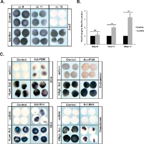 Figure 6. Prolonged MAPK activation alters the timing of pluripotency gene expression.(A–B) Animal pole explant assays examining Sox3 expression in animal cap explants injected with constitutively active Mek (Act-Mek). Explants were cultured alongside sibling embryos and collected at blastula (stage 9), midgastrula (stage 11), and early neurula (stage 13) stages for in situ hybridization (A) or qRT-PCR (B). Activating MAPK leads to retained Sox3 expression. (C) Animal cap explant assay examining Xbra and Endodermin expression in explants cultured with or without activin after injection with constitutively active PI3K (Act-PI3K) or Act-Mek. Explants were cultured alongside sibling embryos and collected at midgastrula stages (stage 11.5). Sustained MAPK activity interferes with Endodermin induction. (ns, not significant; **p<0.01). |