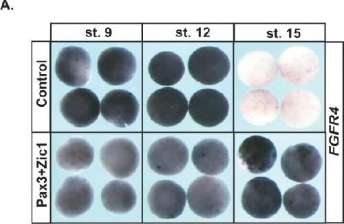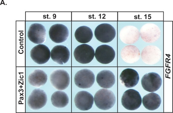 Figure 7—figure supplement 1. Reprograming to a Neural Crest state sustains FGFR4 expression.(A) Animal pole explant assay examining FGFR4 expression in animal cap explants injected with Pax3-GR/Zic1-GR. Explants were cultured alongside sibling embryos and collected at blastula (stage 9), midgastrula (stage 12), and midneurula (stage 15) stages. Reprogramming to a neural crest state causes sustained FGFR4 expression. |