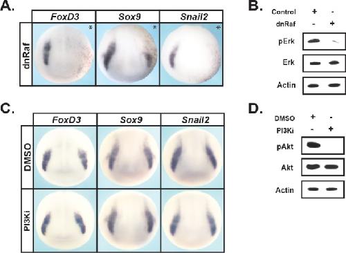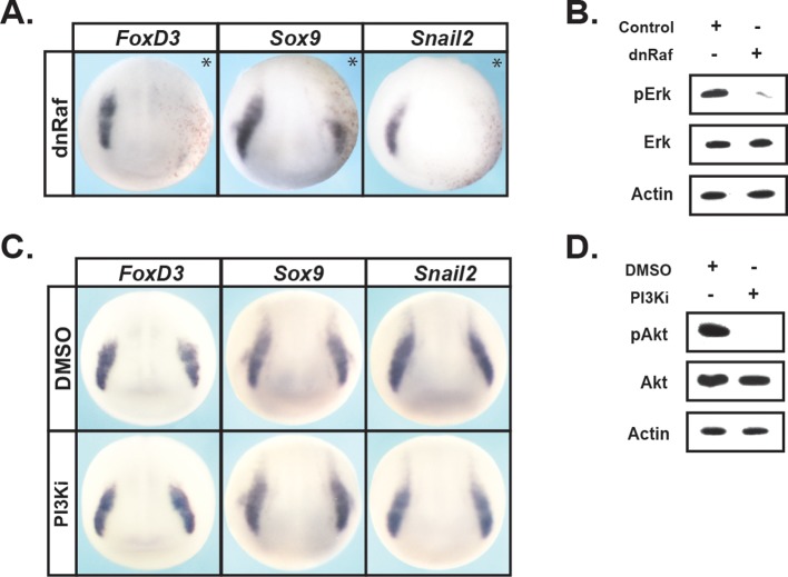 Figure 7—figure supplement 2. MAPK activation is required for neural crest factor expression at mid-neurula stages.(A–D). In situ hybridization examining FoxD3, Sox9, and Snail2 expression in mid-neurula stage (stage 15) embryos injected with dnRaf (A) or treated with the PI3Ki (Wortmannin) (C). Western Blot analyses were conducted with stage nine animal cap explants dissected from dnRaf injected sibling embryos (B) or with mid-neurula stage (stage 15) whole embryos treated with PI3Ki (D). Asterisk denotes injected side, marked by staining of the lineage tracer β-galactosidase (red). Blocking MAPK activation causes a loss of FoxD3, Sox9, and Snail2 expression. |