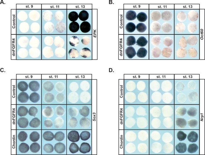 Figure 2. Blocking FGF signaling in pluripotent blastula cells interferes with adoption of an epidermal state and neuralizes cells.(AâD) In situ hybridization examining expression of Epidermal Keratin (EPK) (A) Oct60 (B) Sox3 (C) or Nrp1 (D) in animal pole explants injected with dnFGFR4 or chordin for phenotypic comparison. Explants were cultured alongside sibling embryos and collected at blastula (stage 9), midgastrula (stage 11), and early neurula (stage 13) stages. Blocking FGF signaling interferes with EPK expression and mildly induces Nrp1 expression. |