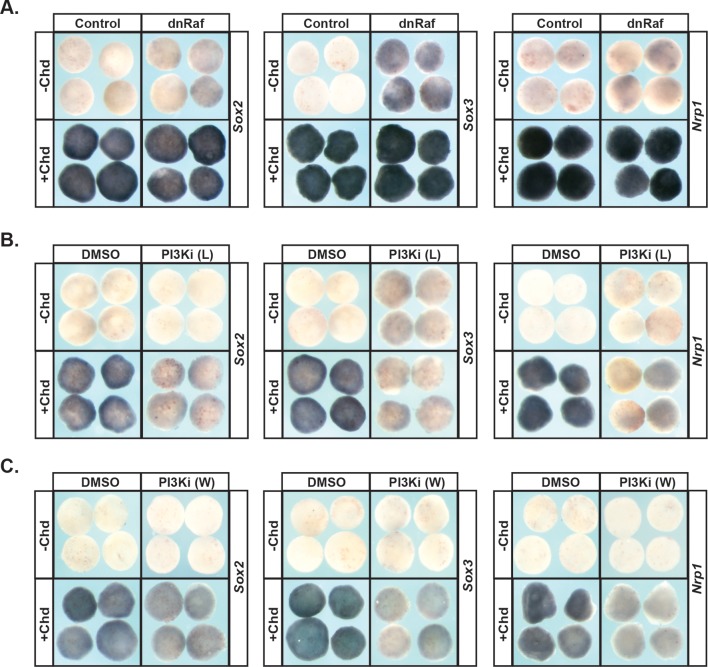 Figure 4—figure supplement 1. Blocking PI3K/Akt activation using PI3Ki (L) (LY294) or PI3Ki (W) (Wortmannin) phenocopies the effects of dnPI3K on Chordin-mediated neural induction.(A–C) Animal pole explant assay examining Sox2, Sox3, and Nrp1 expression in Chordin (Chd) induced animal cap explants injected with dnRaf (A) or treated with PI3Ki (L) (B) or PI3Ki (W) (C). Explants were cultured alongside sibling embryos and collected at early neurula stages (stage 13) for Sox2/3 or late neurula stages (stage 18) for Nrp1. PI3Ki (L) and PI3Ki (W) phenocopy the effects of dnPI3K on Chordin-mediated neural induction. |