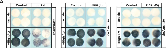 Figure 5—figure supplement 1. MAPK and PI3K/Akt signaling are differentially required for Endodermin expression.(A) Animal pole explant assay examining expression of Endodermin in explants cultured with or without activin after injection with dnRaf or treatment with PI3Ki (L) (LY294) or PI3Ki (W) (Wortmannin). Explants were cultured alongside sibling embryos and collected at midgastrula stages (stage 11.5). MAPK signaling is required for Endodermin induction. |