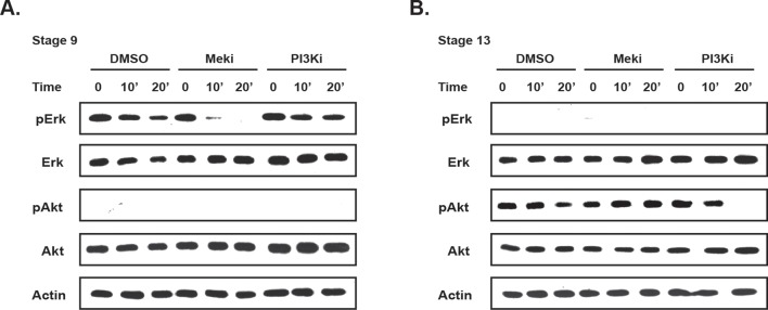 Figure 3—figure supplement 1. Meki (RDEA119) and PI3Ki (LY294) block activation of the MAPK and Akt cascades respectively.(A–B) Western blot of lysates from animal pole explants treated with DMSO, Meki, or PI3Ki. Stage 9 (A) or Stage 13 (B) explants were cultured in vehicle or inhibitor treated media and collected after 0, 10, or 20 min to examine levels of phosphorylated and unphosphorylated Erk1/2 and Akt. Meki blocks pErk but not pAkt, while PI3Ki blocks pAkt but not pErk. |