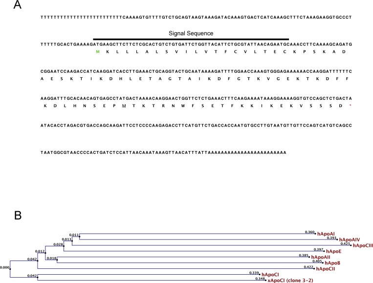 Fig 1. Sequence analysis of Xenopus apoCI.(A) Nucleotide sequence and deduced amino acid sequence of Xenopus apoCI (GenBank accession number: GU562893). Predicted signal sequence of Xenopus ApoCI spans residues 1–20. (B) Phylogenetic tree depicting evolutionary relationship of human Apolipoproteins AI, AII, AIV, B, CI, CII, CIII and E to Xenopus Apolipoprotein CI. The tree was constructed using the UPGMA distance matrix method from CLC Bio Workbench. Numbers at nodes indicate branch length.