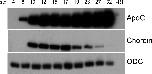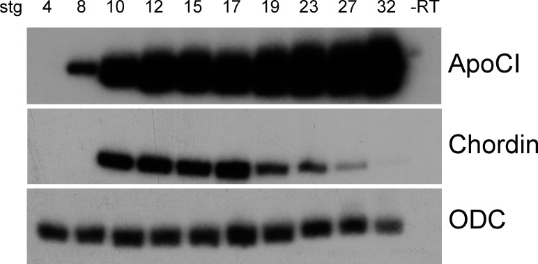 Fig 2. Temporal expression of apoCI mRNA.RT-PCR of RNA isolated from whole embryos between stage 4 and stage 32. Chordin serves as a staging control and Ornithine decarboxylase (ODC) as a control for input RNA levels.