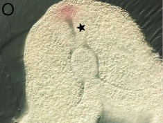 apoCI (apolipoprotein C-I) expression in X. laevis embryo, transverse section through trunk region, NF stage 22, dorsal up, revealing expression of apoCI in the dorsal neural tube (aka roof plate; star indicates the neural tube).
