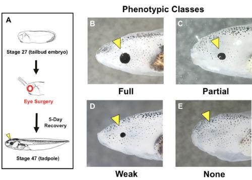 (B) full, regrowth of an eye (with lens) comparable to an unoperated control eye in structure